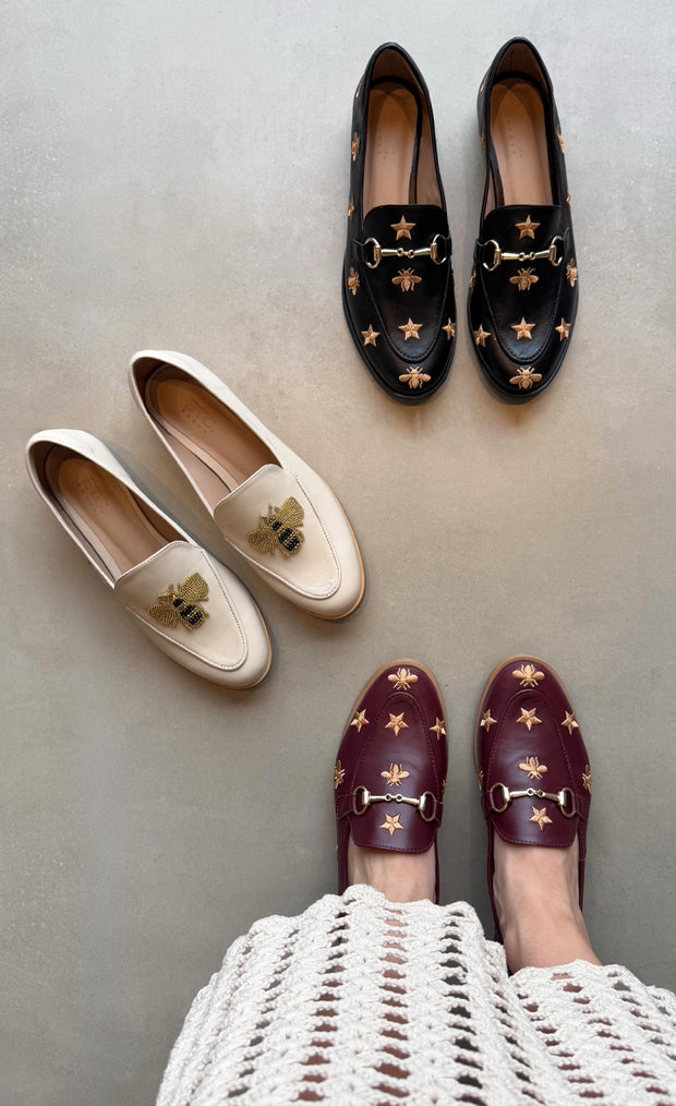 Betina Moccasin – Black Leather with Embroidered Bee & Tractor Sole